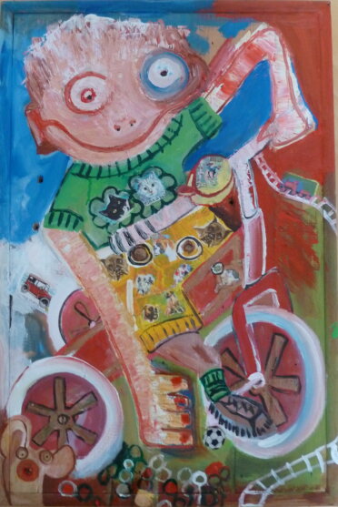Acryl, Briefmarken, Zeitungspapier auf Holz